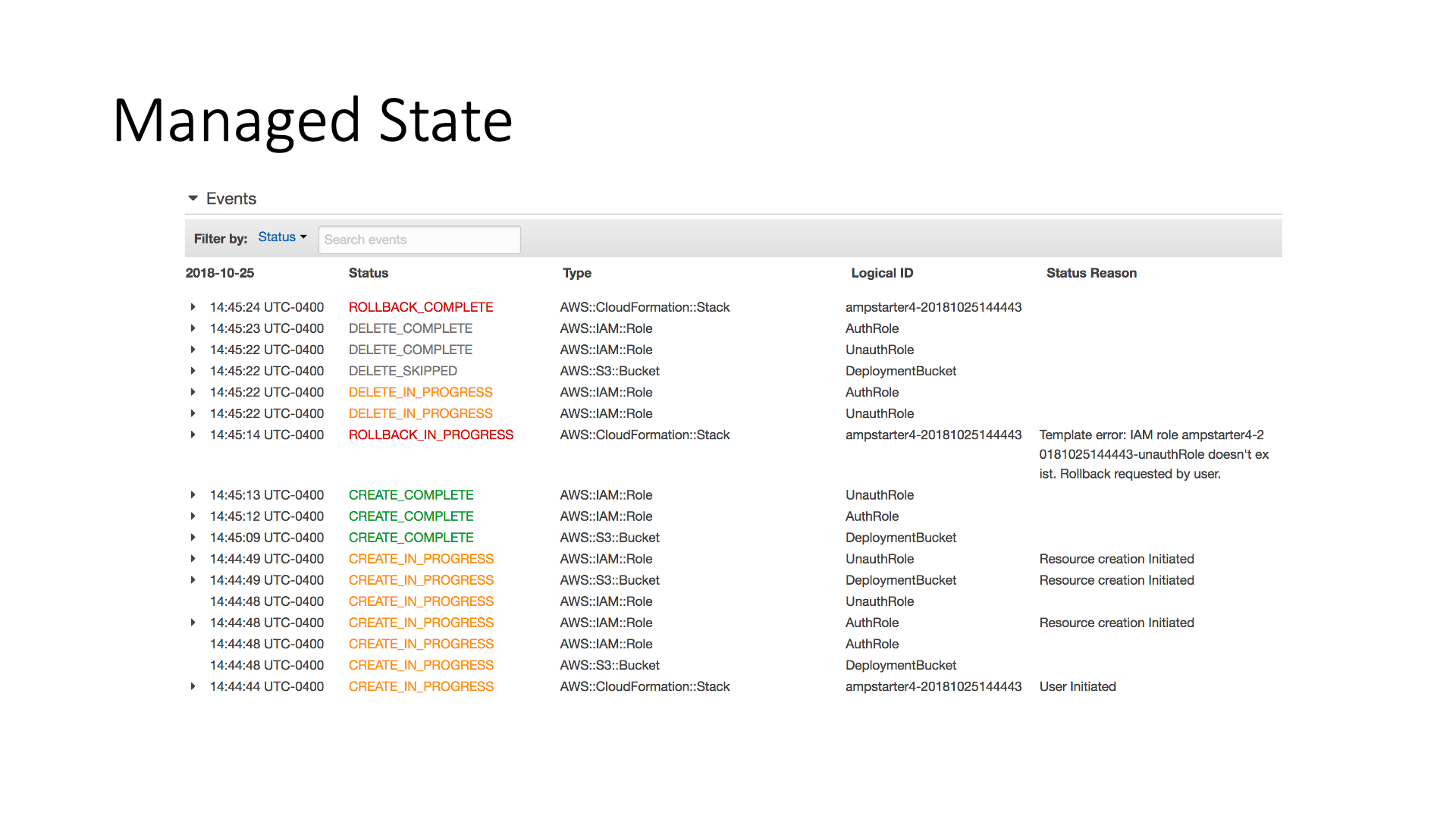 CloudFormation fully manages the infrastructure state. It manages concurrent state changes and resources creation, update, and deletion.