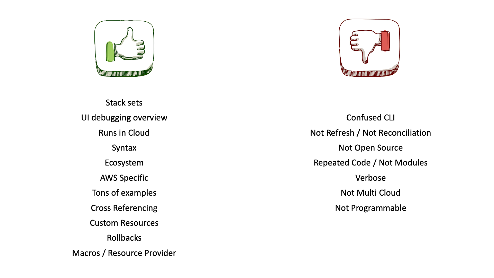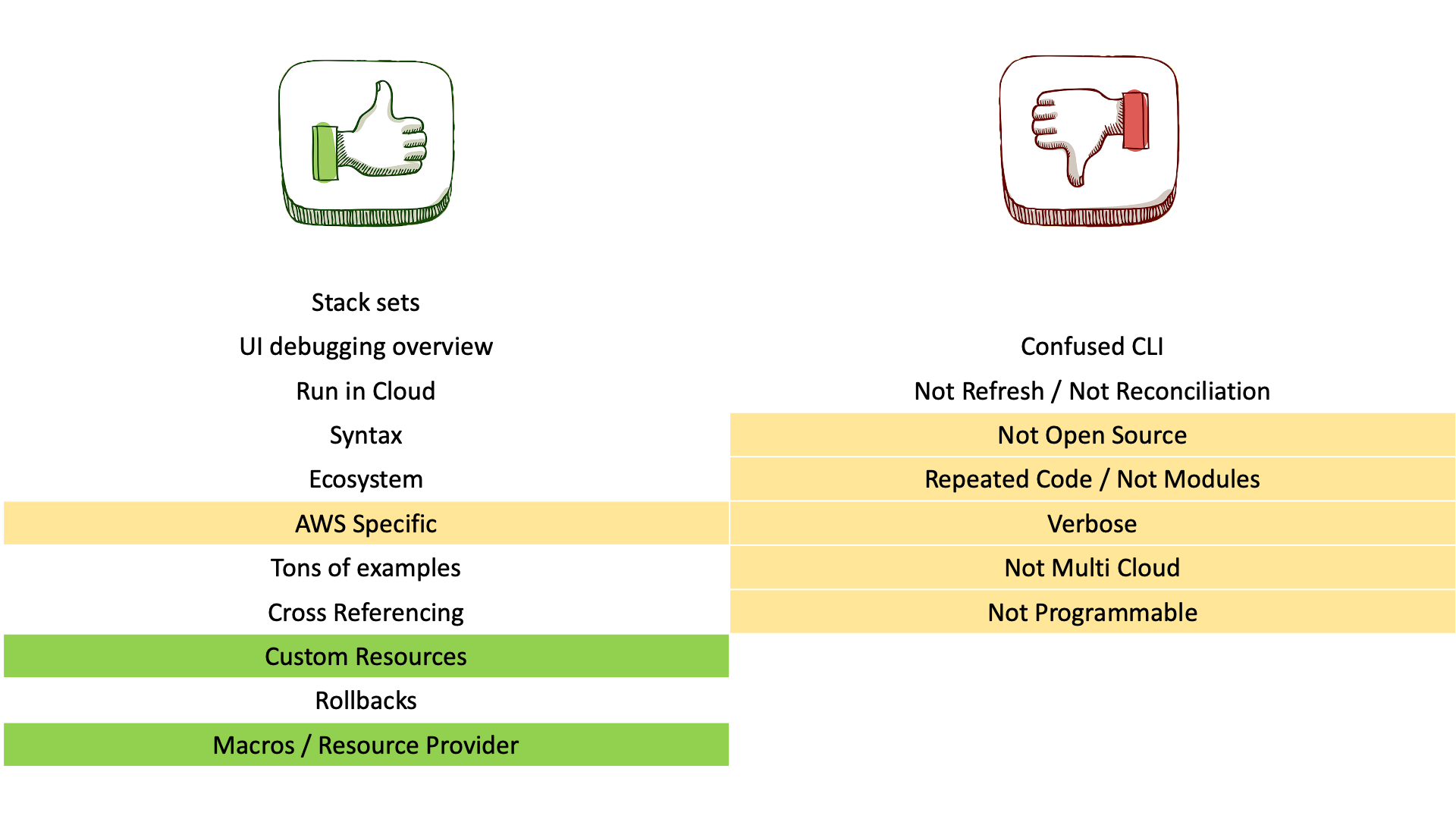 The advantages and disadvantages in the previous slide are from the IaC community, actually thanks to features such as custom resources, macros and resource provider many of the drawbacks no longer apply, or almost apply.