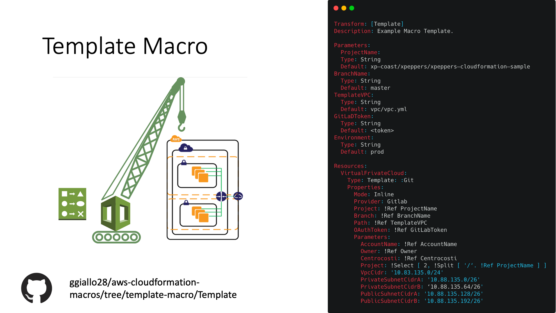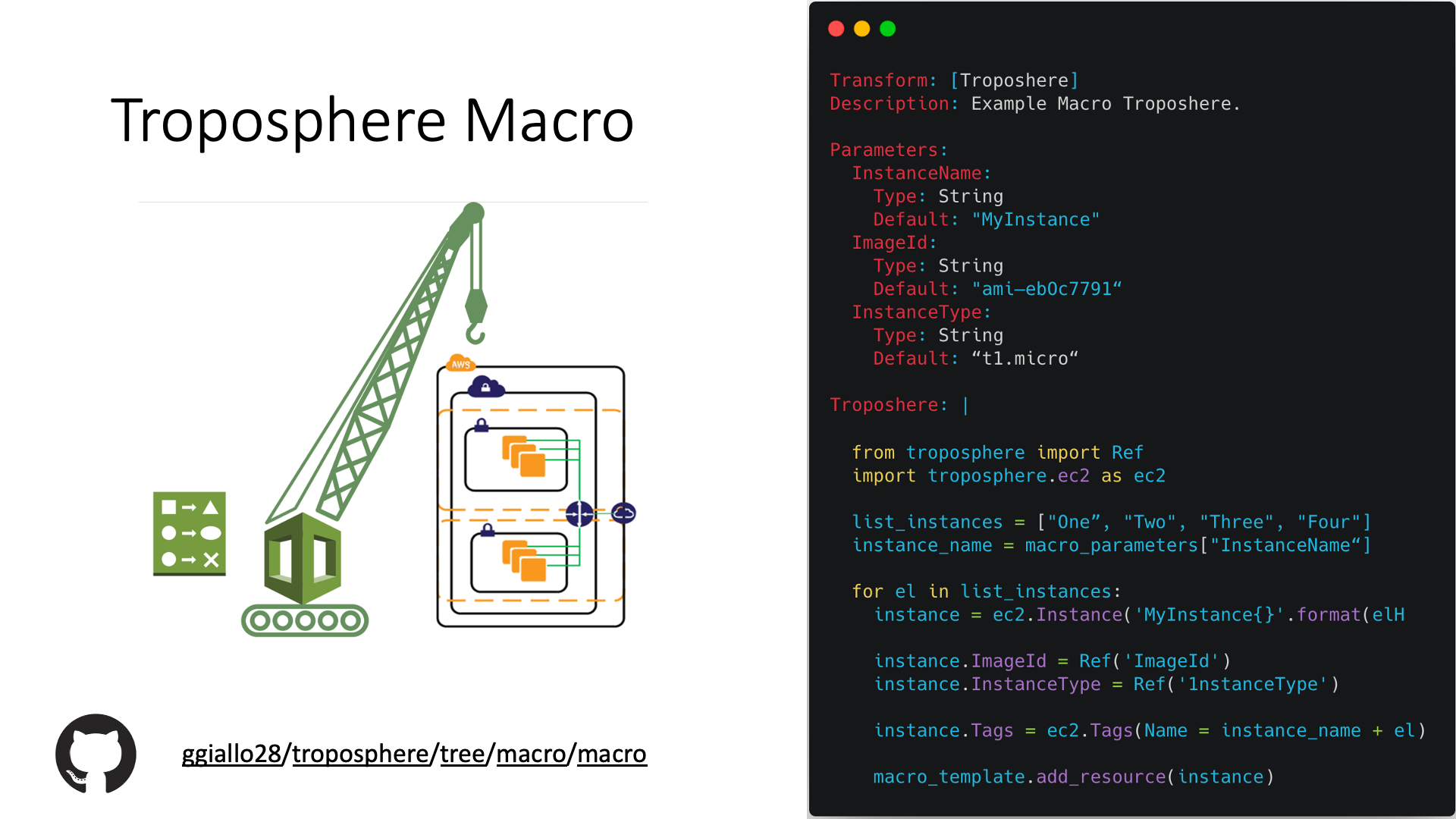 Troposphere Macro adds the ability to define your infrastructure by using Python language in a CloudFormation template, you can use if-then-else, for-loops and so on. Check Troposphere Macro docs if you need further information.