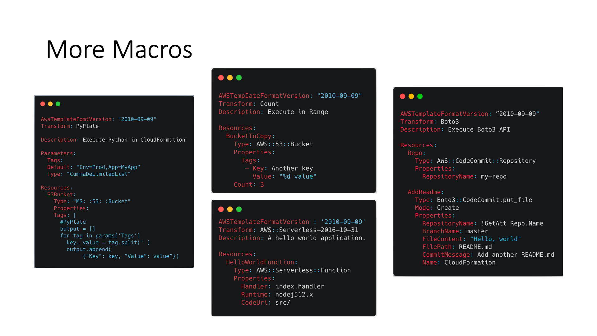 There are more AWS CloudFormation macros you can use, please check Macro Repository if you need further information.