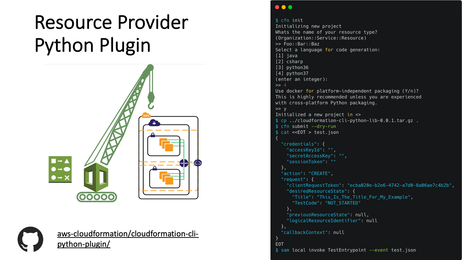 To create third-party resources in your infrastructure you need to execute cfn-init-command and provide the name of your resource type, then it asks for the language to use in code generation and finally, it initializes the project by using docker environment.
