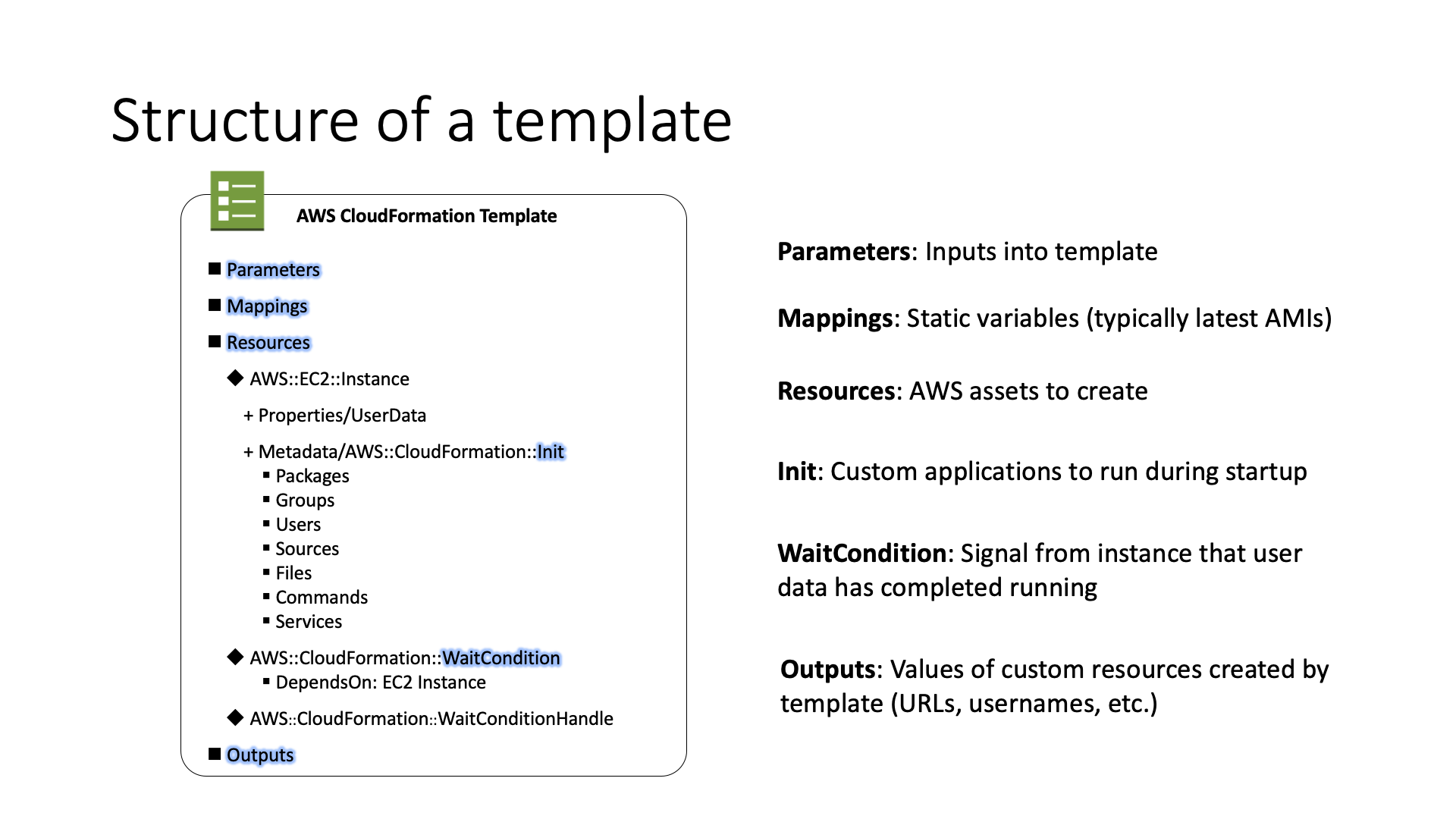 When you launch an instance in Amazon EC2, you have the option of passing user data to the virtual machine to perform automated configuration tasks, but it is hard to declare a configuration in it because you will end on in doing a lot of shell programming which is not as reliable as configuration management should be, instead AWS::CloudFormation::Init can be used.