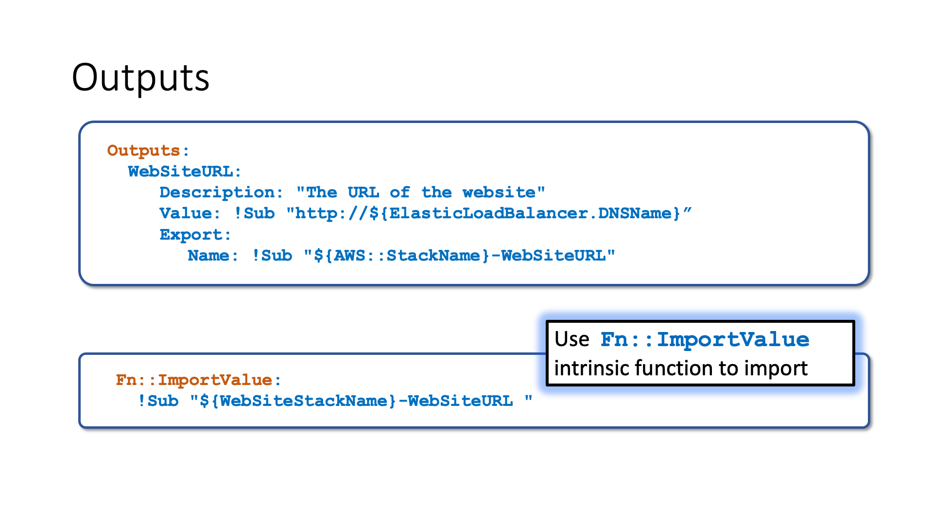 AssertDescription: For the prod environment, the instance type must be m1.largeOutputs are the return values of your CloudFormation template, they can be exported and then used in another template. The exported name must be unique in the region, it can be imported into any CloudFormation template of the same region. When you use ImportValue intrinsic function only the value is imported not the whole state.