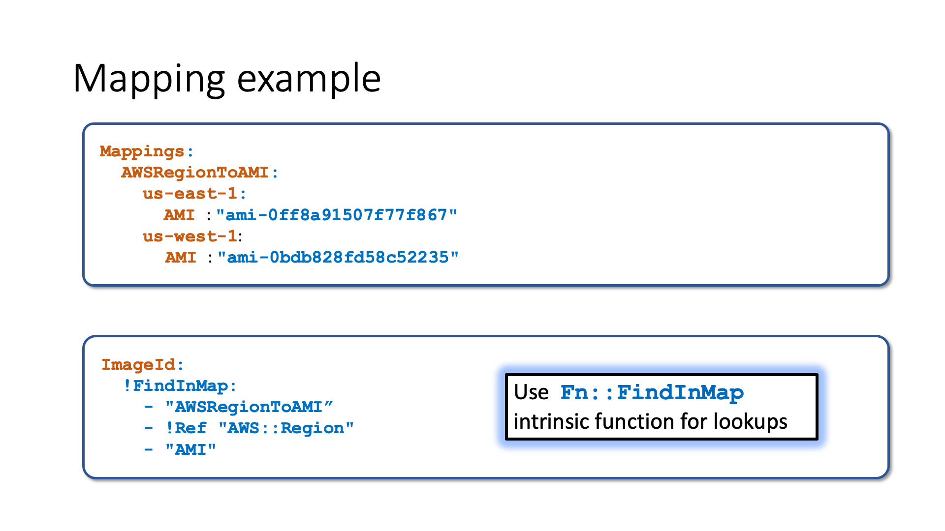 Mappings allow you to create generic templates, and define a complex configuration using a key-value map. For example, you can have a region-independent template as it is shown in the below slide. As you know each AMI has its identifier that is only valid in the given region, Mappings allows you to specify for each Region which AMI id to use.